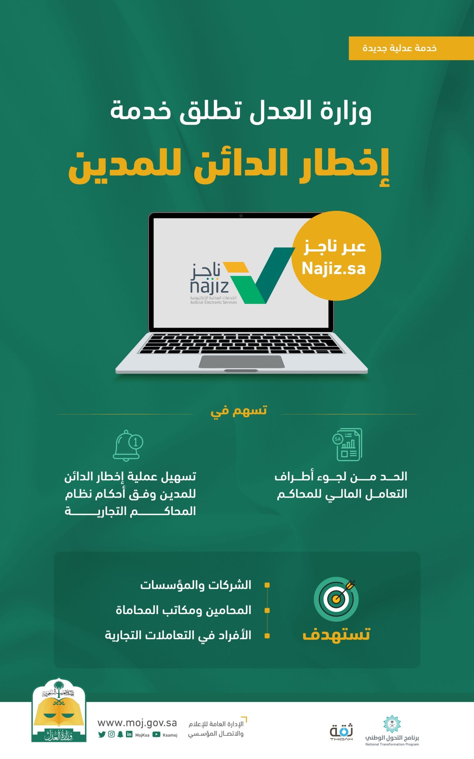 أطلقت وزارة العدل خدمة الإشعار بأداء الحق، من خلال خدمات التبليغ العدلي في بوابة ناجز Najiz.sa، والتي تضمن وتوثق إخطار الأطراف بالمبلغ الذي يجب استيفاؤه ليقوم بالسداد خلال مدة معلومة.
