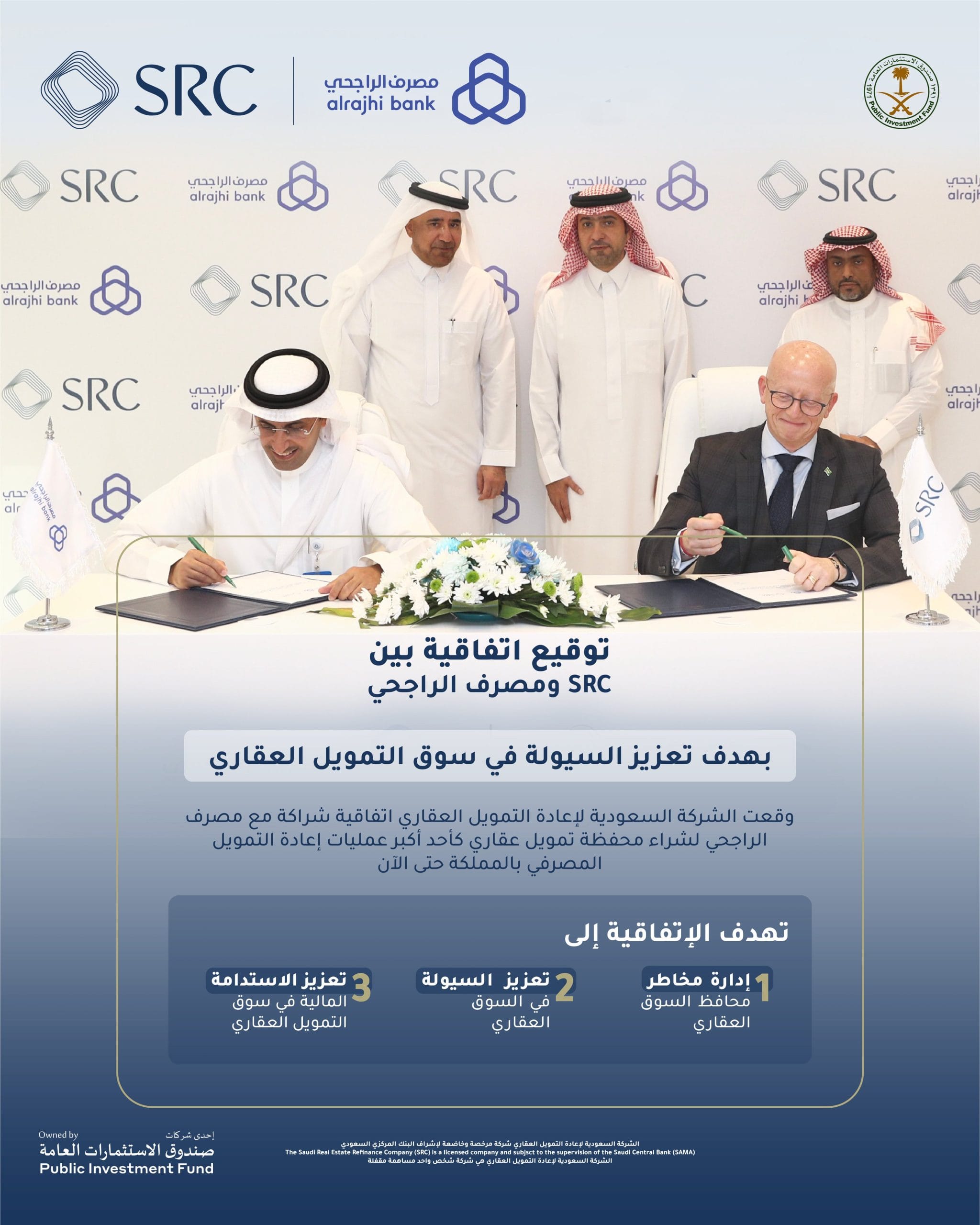 وتأتي هذه الاتفاقية التي وقعها كل من الرئيس التنفيذي للشركة فابريس سوسيني، والعضو المنتدب والرئيس التنفيذي للمصرف وليد عبد الله المقبل، امتداداً لجهود الشركة المتواصلة لدعم سوق التمويل العقاري السكني في المملكة، من خلال التوسع في إعادة التمويل العقاري؛ وتقديم حلول SRC لجهات التمويل العقاري لدعم النمو والاستقرار المالي في سوق التمويل العقاري، وتعد هذه أكبر اتفاقية من نوعها في القطاع البنكي السعودي.