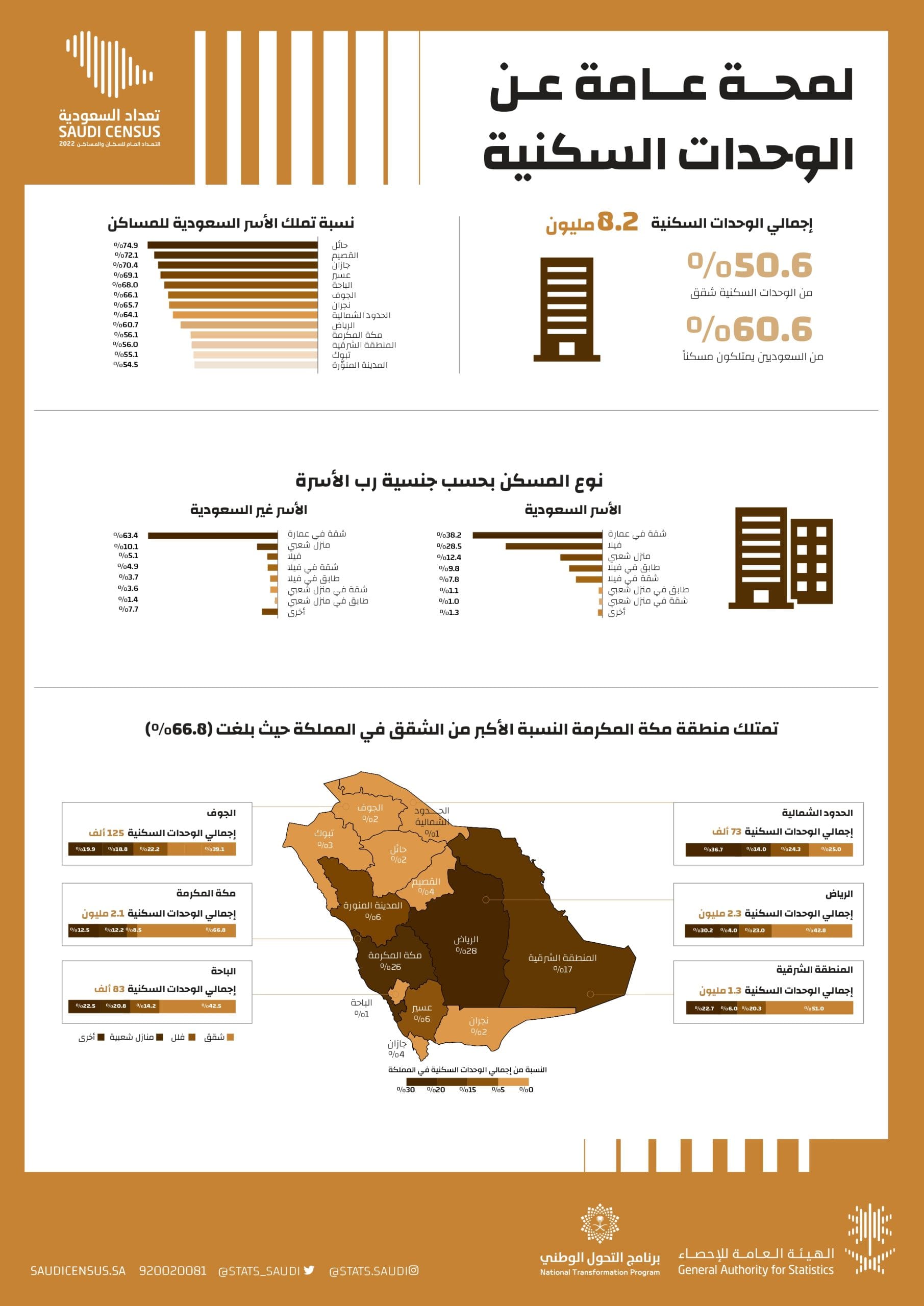Announced الهيئة العامة للإحصاء اليوم الأربعاء أن إجمالي الوحدات السكنية في المملكة، بلغ في الآونة الأخيرة 8.2 مليون وحدة، وجاءت الشقق فيها بنسبة 50.6% (أغلبها في مكة المكرمة بنسبة 66.8%)، وأصبح 60.6% من المواطنين السعوديين يمتلكون مسكنًا، لاسيما بعد برنامج “سكني” الطموح.