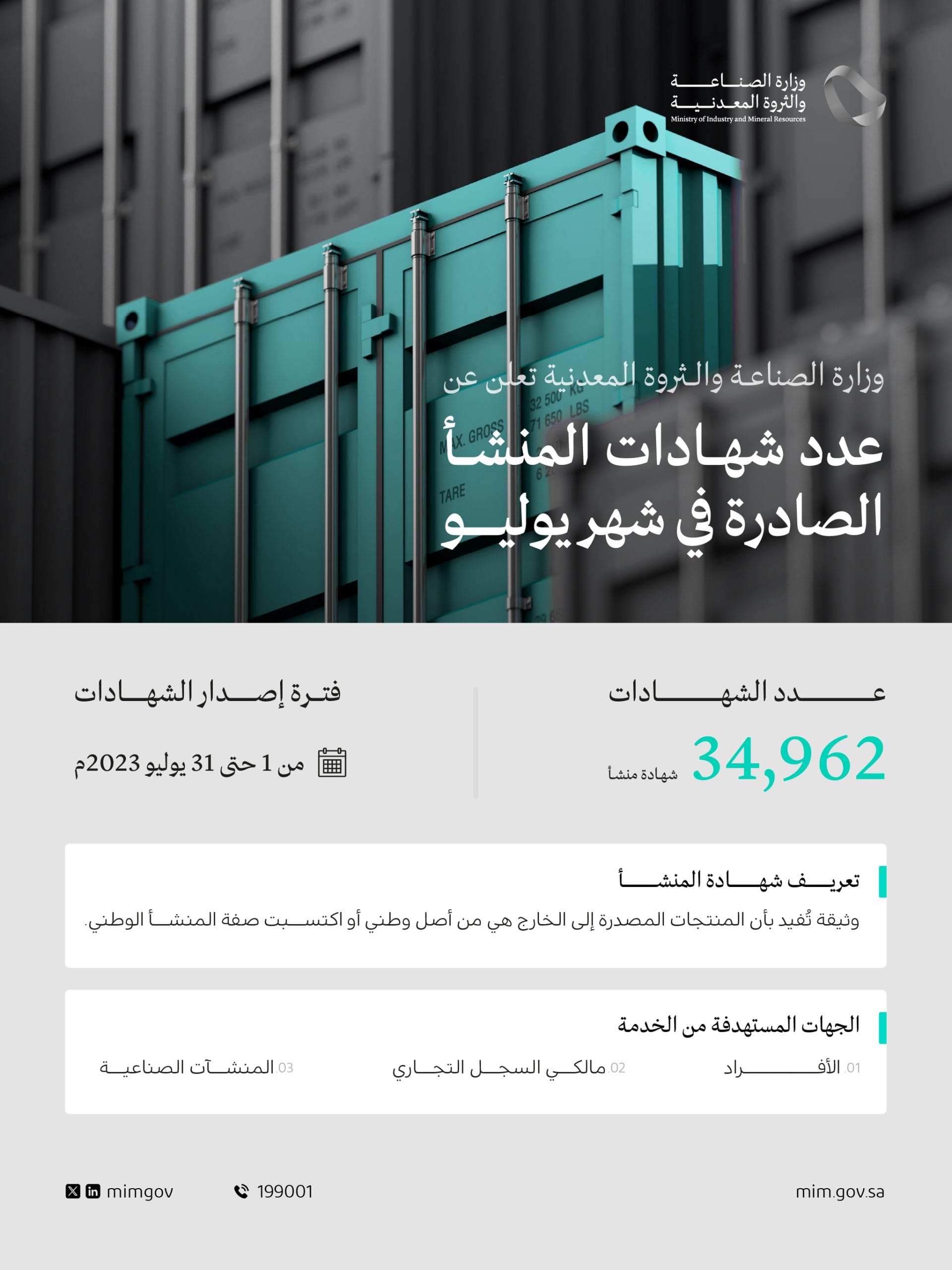 أصدرت وزارة الصناعة والثروة المعدنية 34962 ألف “شهادة منشأ” خلال شهر يوليو، وذلك في إطار سعيها لدعم الخدمة وتسهيلها على المصدرين في مختلف القطاعات سواء الصناعي، أو التجاري، أو قطاع الأفراد.