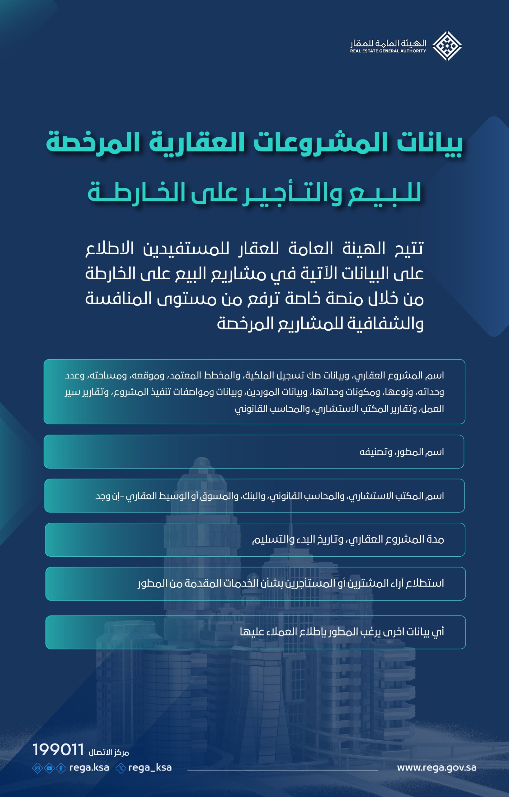 أعلنت الهيئة العامة للعقار، أنها تتيح للمستفيدين الاطلاع على بيانات المشروعات العقارية المرخصة للبيع أو التأجير على الخارطة من خلال منصة خاصة ترفع من مستوى المنافسة والشفافية للمشاريع المرخصة.