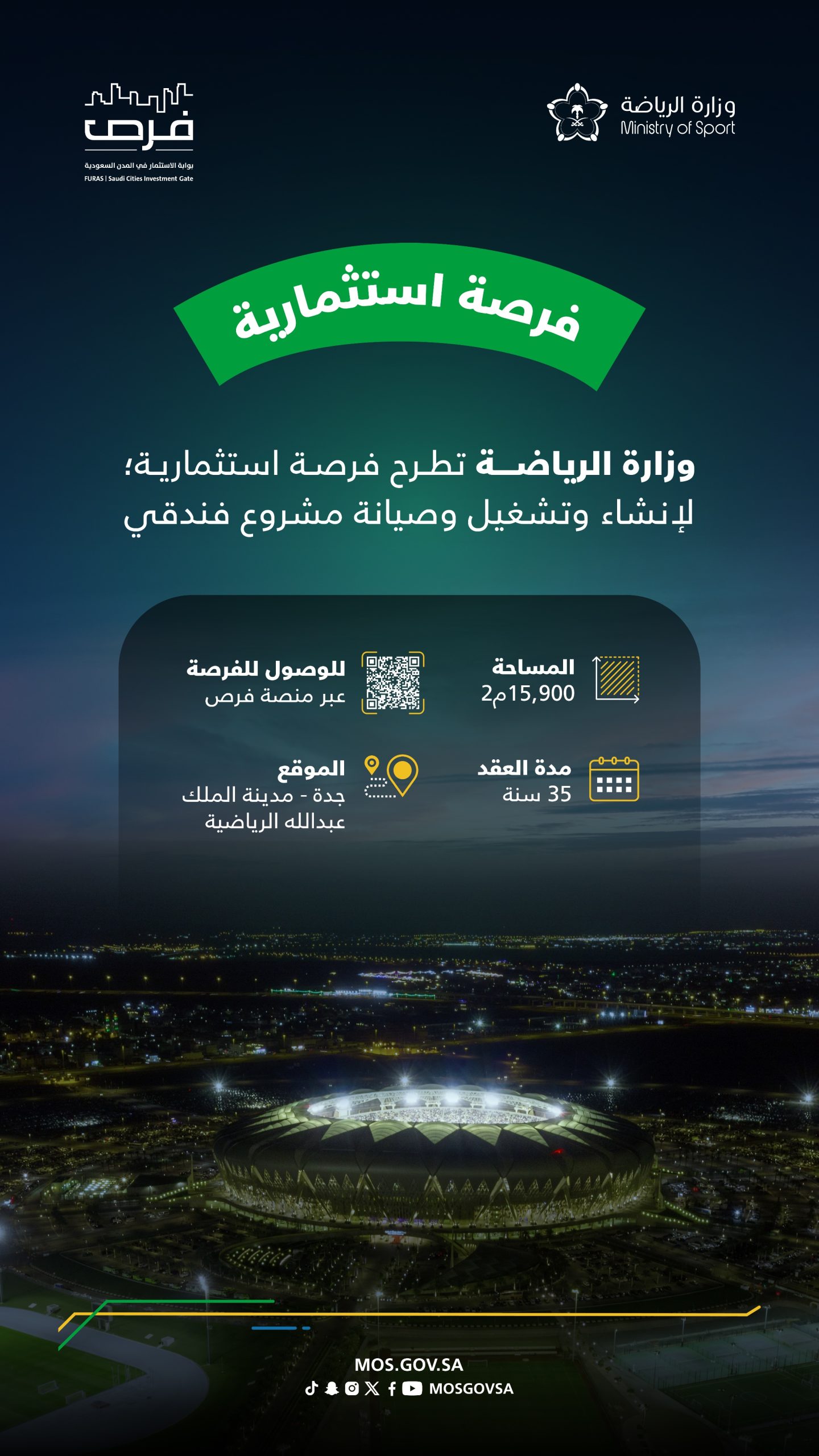 وقالت الوزارة في إنفوجراف نشرته على حسابها بموقع التواصل الاجتماعي “إكس”، إن المشروع يقع على مساحة 15900 متر مربع، حيث ستكون مدة العقد 35 عاما، وفقا للتفاصيل التي أعلنتها وزارة الرياضة اليوم.