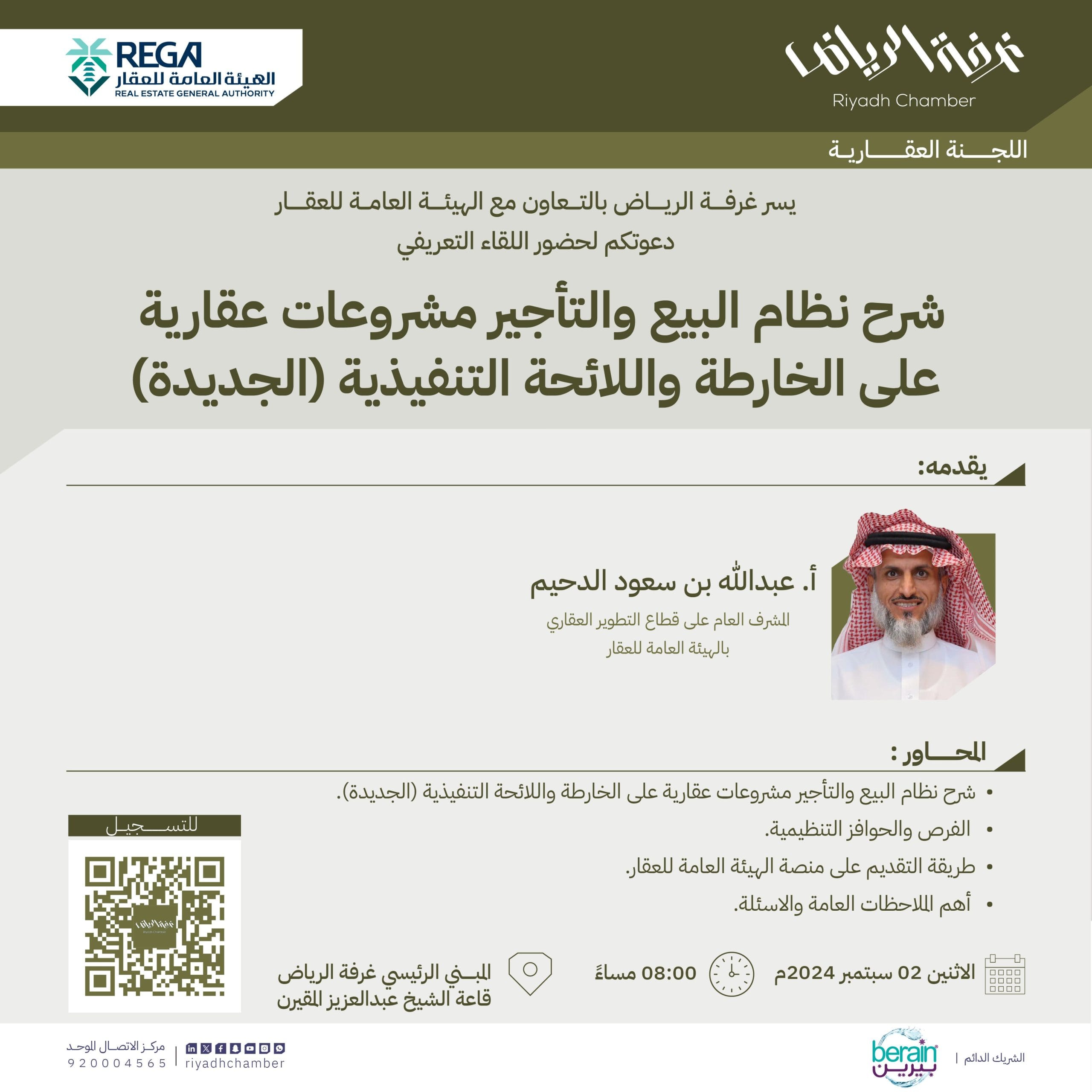 تنظم اللجنة العقارية بغرفة الرياض بالتعاون مع الهيئة العامة للعقار لقاءا تعريفيا يوم الاثنين المقبل الموافق 2 سبتمبر 2024، لشرح نظام البيع والتأجير مشروعات عقارية على الخارطة واللائحة التنفيذية الجديدة.