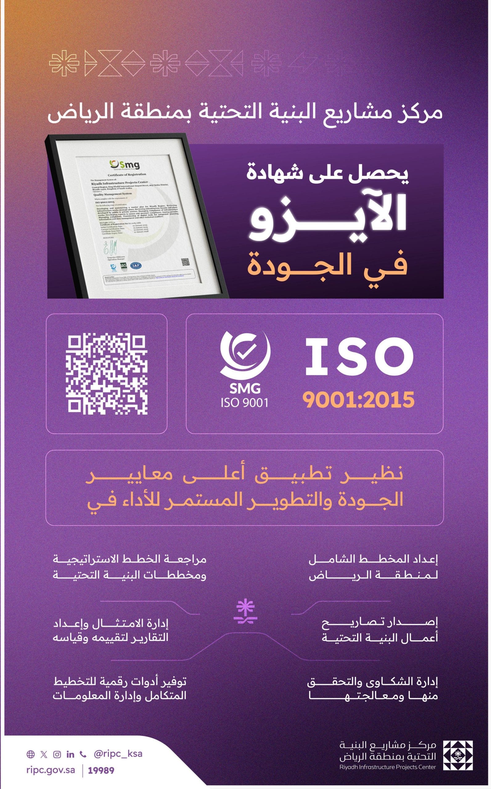 It is noteworthy that the certificate was awarded in recognition of its efforts to apply the quality system, through a comprehensive review and audit of the governance of the Center's procedures. <ISO 9001:2015 certification is awarded by the International Organization for Standardization (ISO) to entities that succeed in applying a set of tests, processes and procedures to the facility to measure its ability to plan and implement an outstanding quality management system and its ability to meet the requirements of beneficiaries.