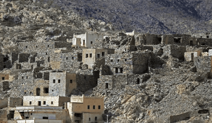 Sarawat Mountains Architecture: Based on multicolored stones, facades with wooden columns and stone decorations.