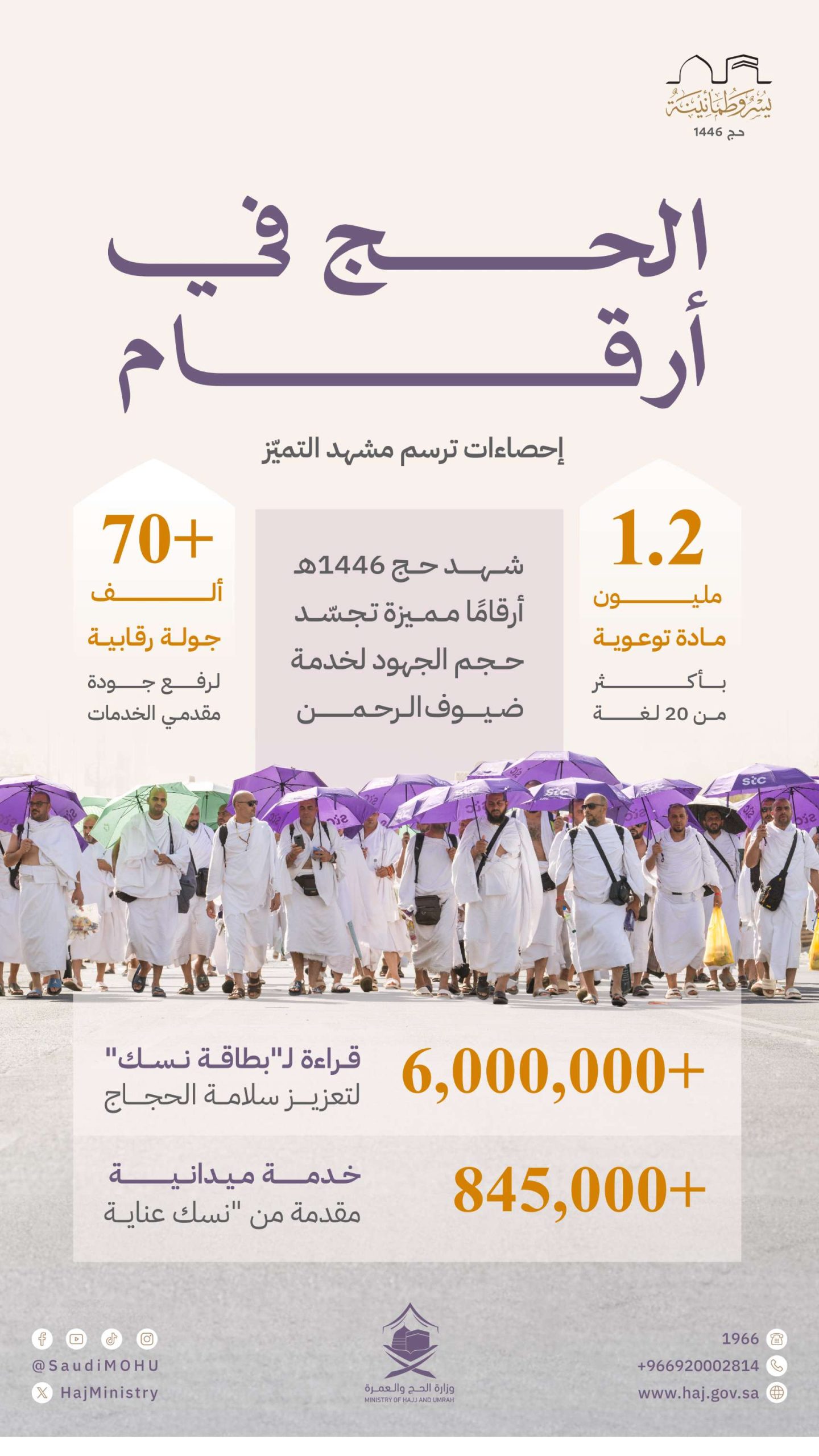 وبيَّنت وزارة الحج والعمرة أن هذه الأرقام المسجلة، تأتي في إطار عمل مؤسسي منسّق يجمع بين الجهات الحكومية والخدمية، ويعتمد على تكامل الكوادر البشرية مع التقنيات الحديثة، بما يضمن تقديم تجربة حج آمنة وميسّرة تعبّر عن مستوى العناية والجاهزية التي توليها المملكة لحجاج بيت الله الحرام.
