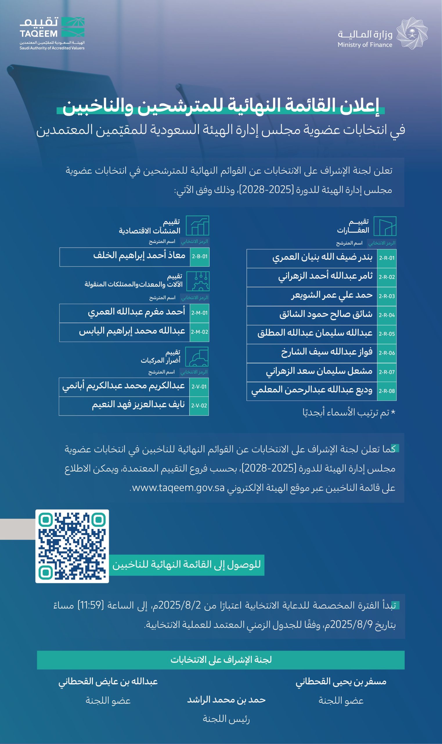 ودعت اللجنة الناخبين والمهتمين إلى الاطلاع على التفاصيل الكاملة للقوائم النهائية للمرشحين والناخبين عبر موقع الهيئة الإلكتروني: [www.taqeem.gov.sa](http://taqeem.gov.sa)، وذلك لضمان المشاركة الفاعلة والاطلاع على الأسماء والبيانات المحدثة قبل انطلاق التصويت.