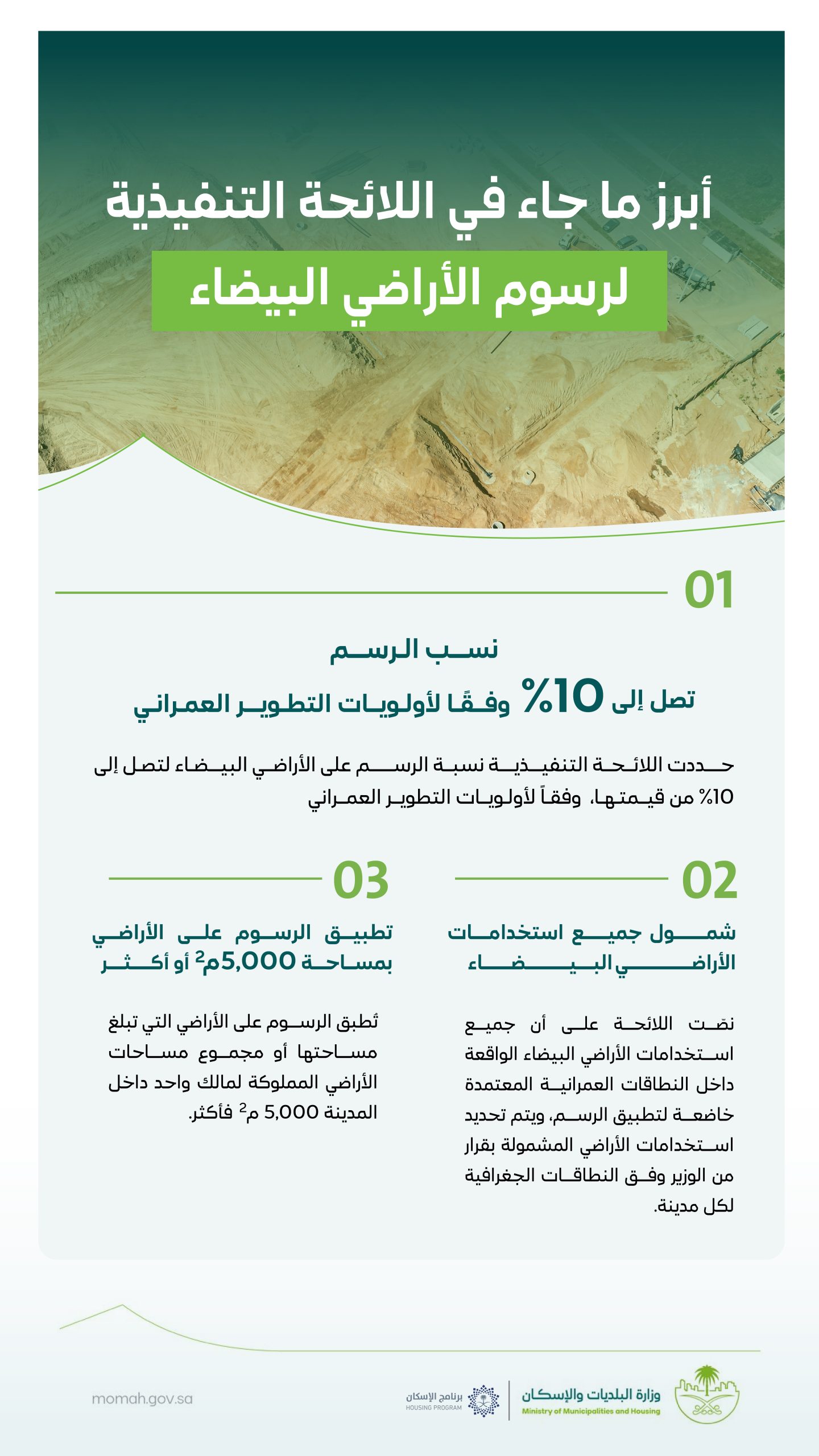 أعلنت وزارة البلديات والإسكان عن اعتماد اللائحة التنفيذية لرسوم الأراضي البيضاء، في خطوةٍ تنظيميةٍ تهدف إلى زيادة المعروض من الأراضي المطورة بما يحقق التوازن بين العرض والطلب، وزيادة المعروض من الوحدات العقارية، وحماية المنافسة العادلة، ومكافحة الممارسات الاحتكارية.