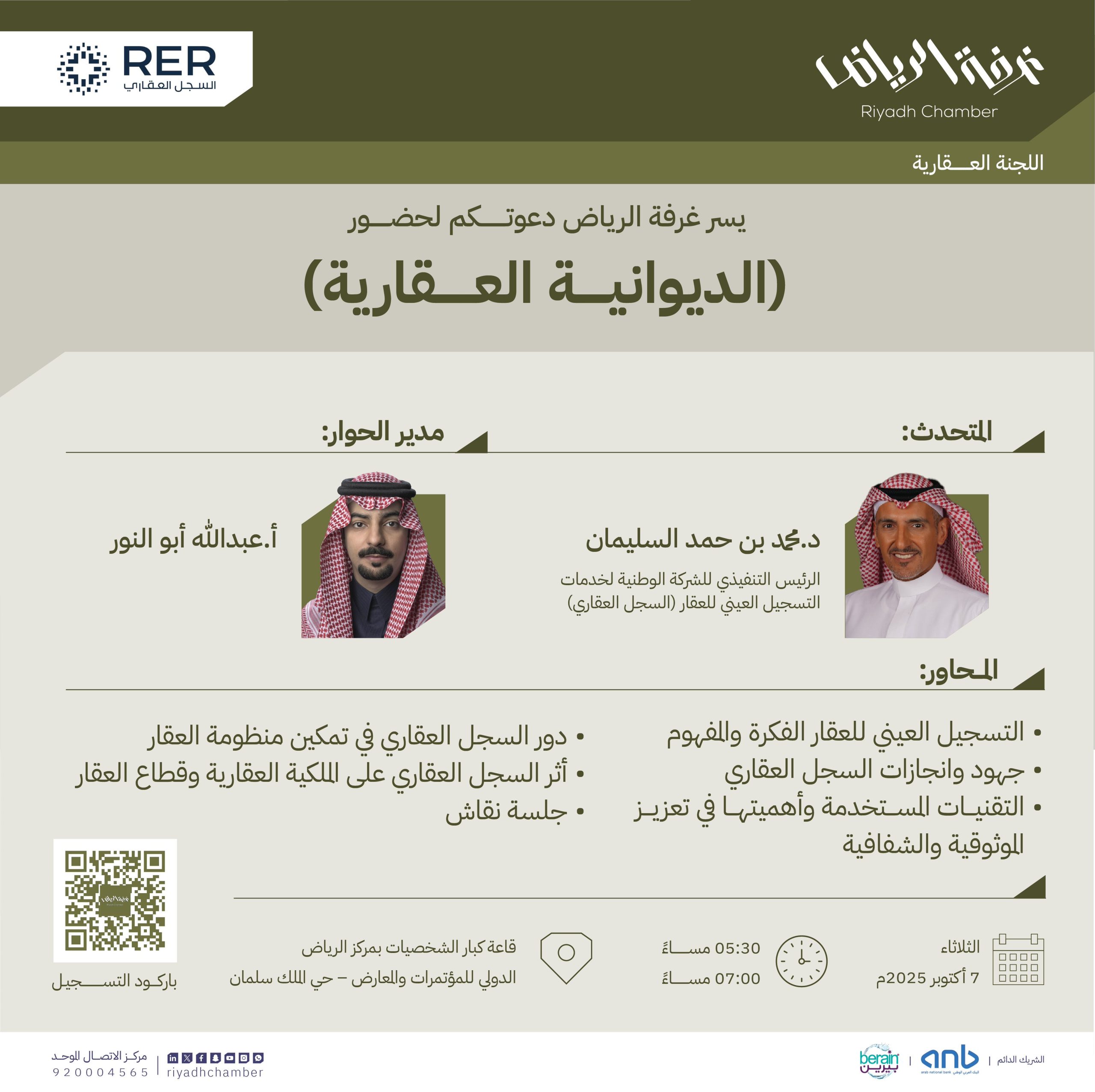 تنظم اللجنة العقارية بغرفة الرياض، يوم الثلاثاء 7 أكتوبر 2025 لقاء “الديوانية العقارية“، الذي يركز على دور السجل العقاري في تمكين منظومة القطاع العقاري وتعزيز الشفافية والموثوقية. وذلك في قاعة كبار الشخصيات بمركز الرياض الدولي للمؤتمرات والمعارض ، الساعة الخامسة ونصف مساءً.