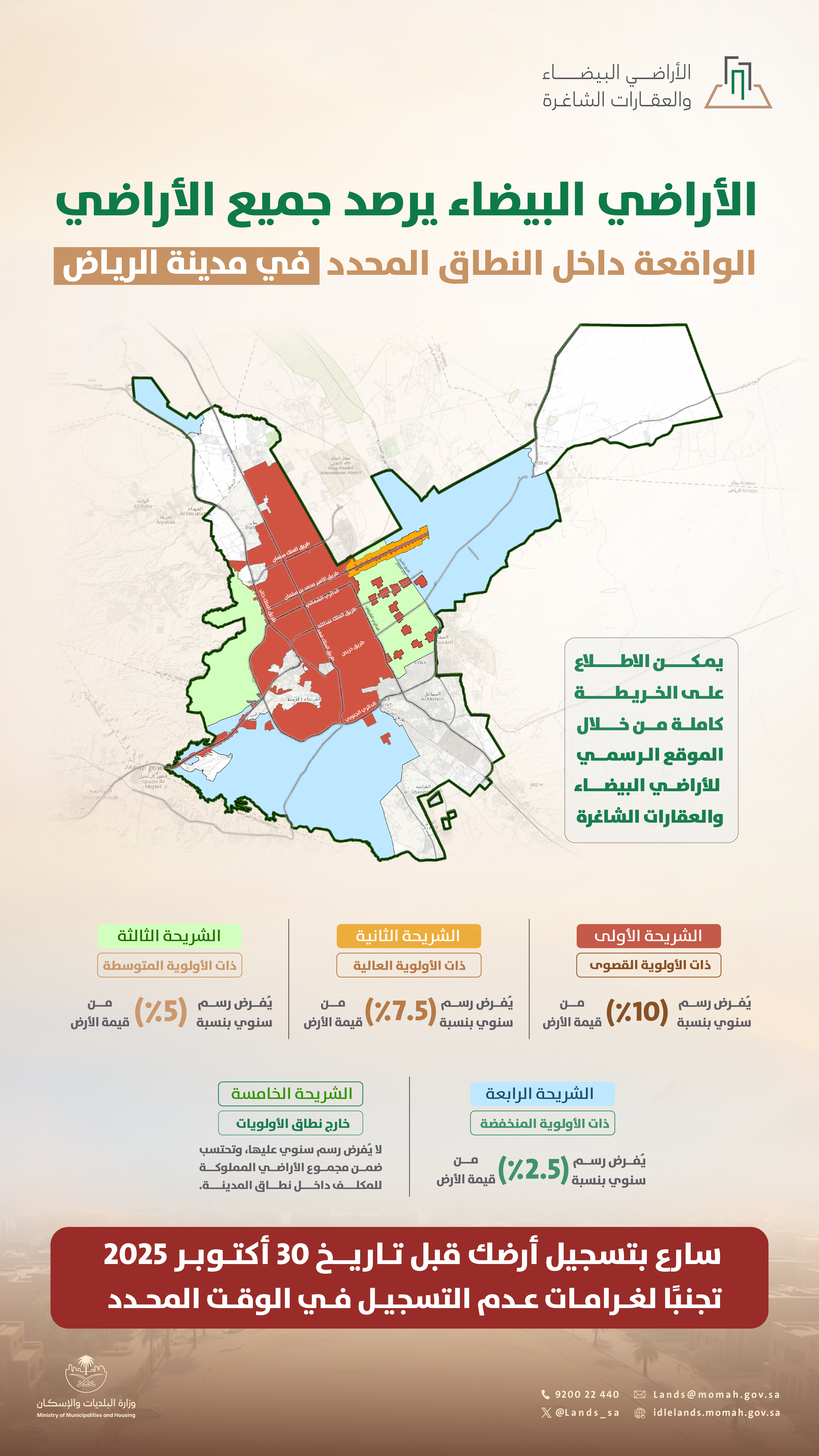 The program called on all owners whose lands fall within the ranges subject to the system to register through the electronic platform before October 30, 2025, to avoid fines and benefit from the facilitated digital services provided by the system, stressing that the system will begin in the coming period to impose fines on unregistered lands, which may reach 100% of the value of the basic fee.