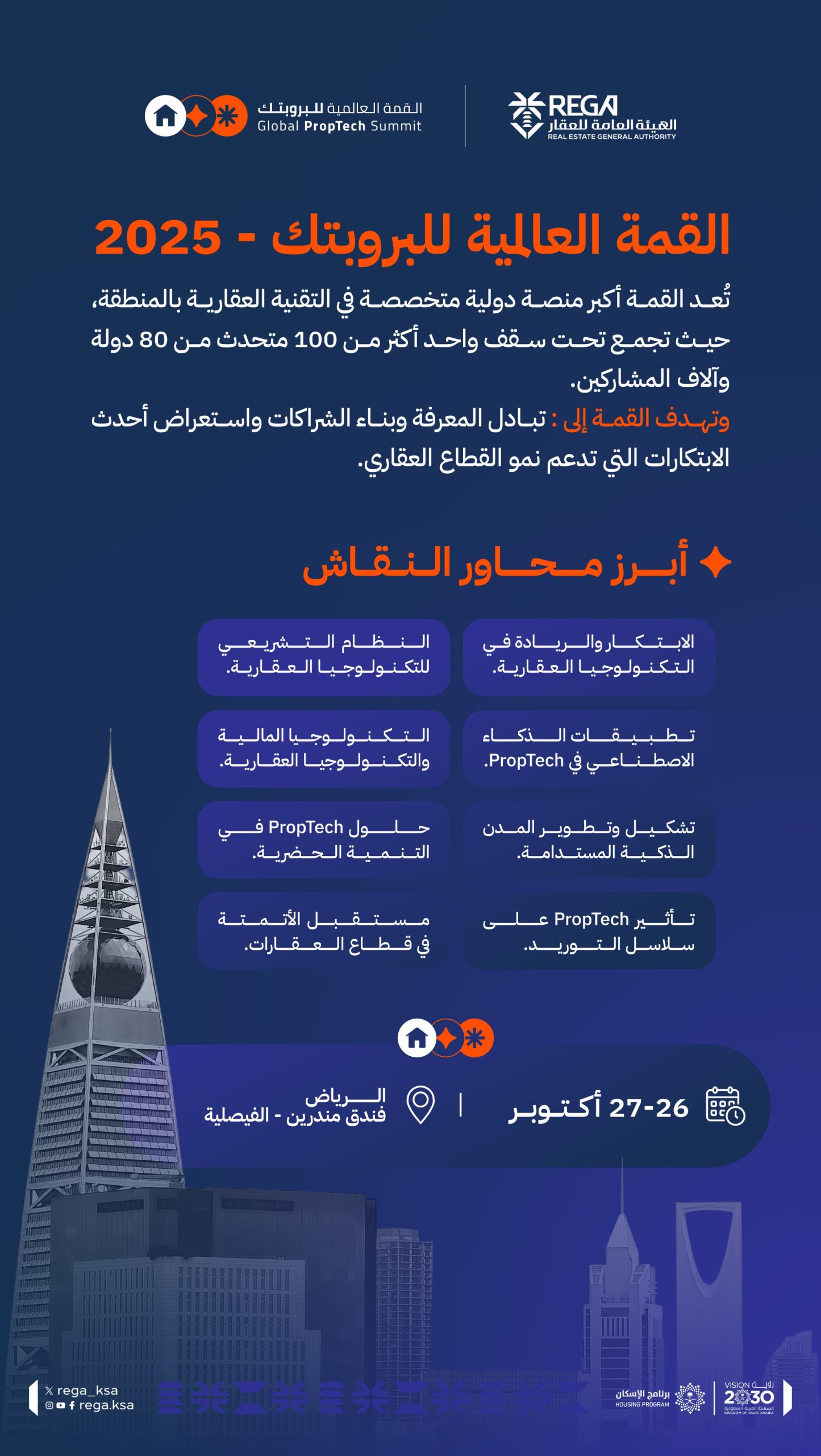 كما تستضيف “القمة العالمية للبروبتك ” أبرز المنصات العقارية وشركات التقنية المالية ورواد الأعمال والخبراء والشركات الاستشارية والمعاهد التدريبية والمطورين، وستتضمن القمة عددًا من الإطلاقات والاتفاقيات التي تخدم قطاع التقنية العقارية، وتمثل القمة منصة للشراكات مع الجهات العالمية وبوابة للشركات الناشئة والواعدة والرائدة لعرض حلولها المبتكرة في صناعة العقار والالتقاء بالمستثمرين وأصحاب رؤوس الأموال الجريئة.