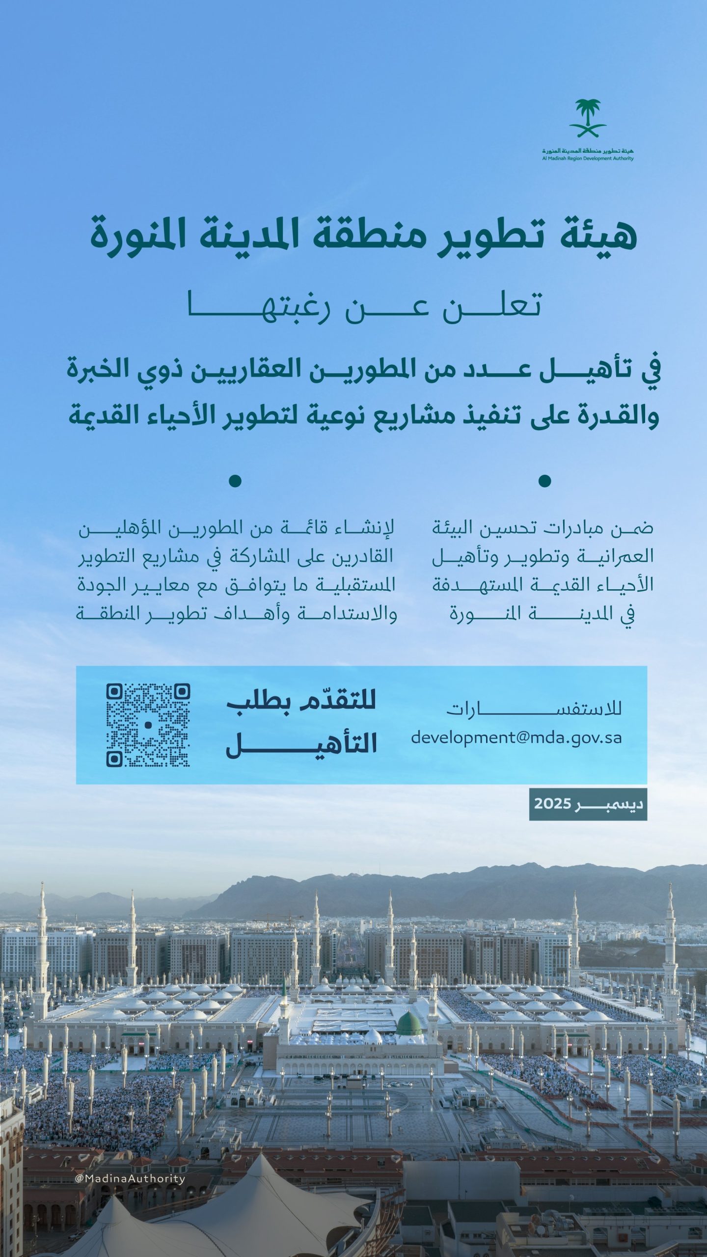 أعلنت هيئة تطوير منطقة المدينة المنورة عن فتح باب تأهيل عدد من المطورين العقاريين، ممن يمتلكون الخبرة والقدرة الفنية والتنفيذية، للمشاركة في مشاريع نوعية تستهدف تطوير الأحياء القديمة في المدينة المنورة.