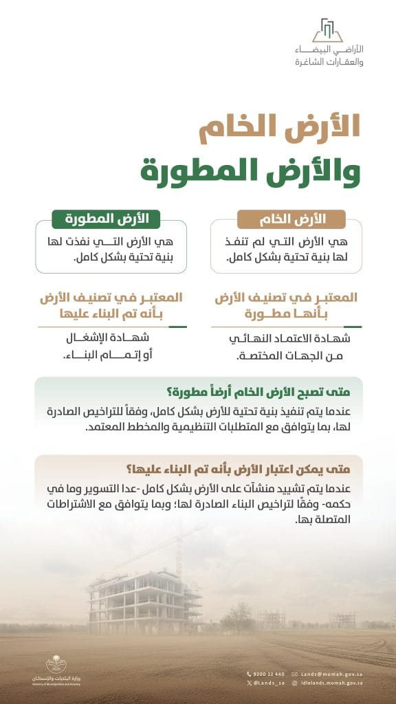 في إطار تنظيم السوق العقارية ورفع كفاءة استخدام الأراضي، تتضح أهمية التمييز بين الأرض الخام والأرض المطورة، ليس فقط من حيث التعريف، بل وفق معايير نظامية دقيقة ترتبط بالبنية التحتية والتراخيص والاعتمادات الرسمية. هذا التصنيف يشكّل أساسًا مهمًا لتحديد الالتزامات النظامية والرسوم المرتبطة بالأراضي.