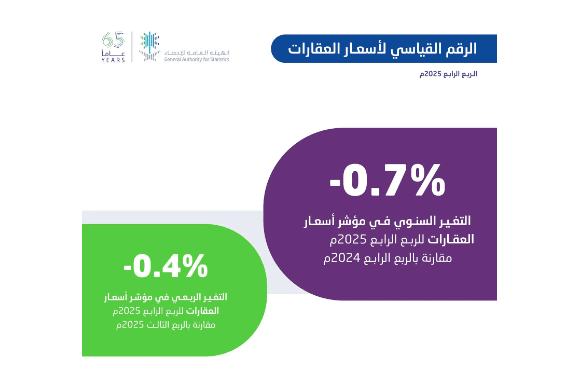 <According to the General Authority for Statistics, the Kingdom's real estate price index for the fourth quarter of 2025 recorded a decrease of 0.7% during the fourth quarter of 2025 compared to the fourth quarter of 2024, mainly due to the decrease in residential sector prices by 2.2%, driven by the decrease in residential land prices by 2.4%, apartments prices by 2.5%, villas prices by 1.3%, and residential floors prices by 0.2%.
