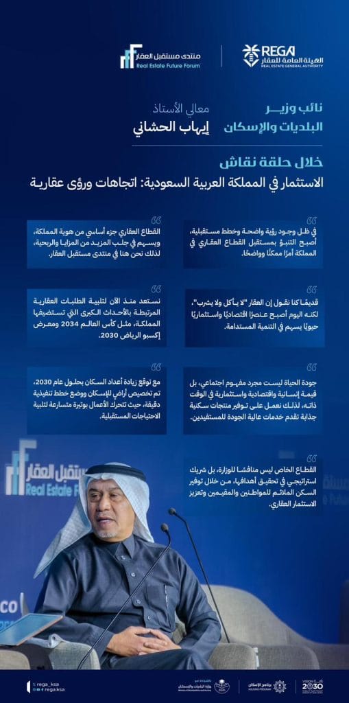 Hashani stressed that quality of life is a long-term approach to improving the urban environment. It is noteworthy that the Future of Real Estate Forum 2026 in its fifth edition is being held in the capital Riyadh, under the slogan “Horizons expand and real estate thrives”, under the patronage of His Excellency the Minister of Municipalities and Housing and Chairman of the Board of Directors of the General Authority for Real Estate, Mr. Majid bin Abdullah Al-Hogail, with wide international participation, and accompanied by a specialized real estate exhibition that reviews the latest real estate technologies, sustainable building materials and digital solutions, as well as a platform to sign a number of agreements and memorandums of understanding.