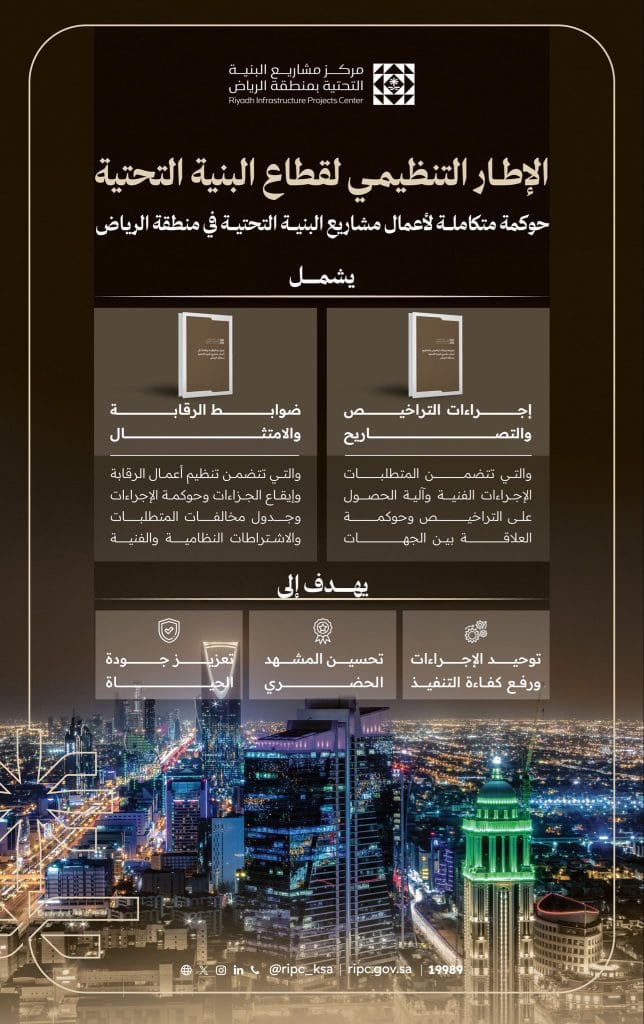 أعلن مركز مشاريع البنية التحتية بمنطقة الرياض عن مبادرة الإطار التنظيمي لقطاع البنية التحتية، التي تشمل ضوابط إجراءات تراخيص وتصاريح أعمال مشاريع البنية التحتية بمنطقة الرياض، وجدول المخالفات وإجراءات رصدها وضبطها، وذلك في إطار دور المركز التنظيمي والرقابي لتنظيم أعمال القطاع، ورفع كفاءة تنفيذ مشاريع البنية التحتية، وضمان معايير الجودة والسلامة، وحماية الأصول والمرافق العامة، بما يُسهم في الحد من التعارضات والتكرار، وتحسين المشهد الحضري وجودة الحياة في منطقة الرياض.