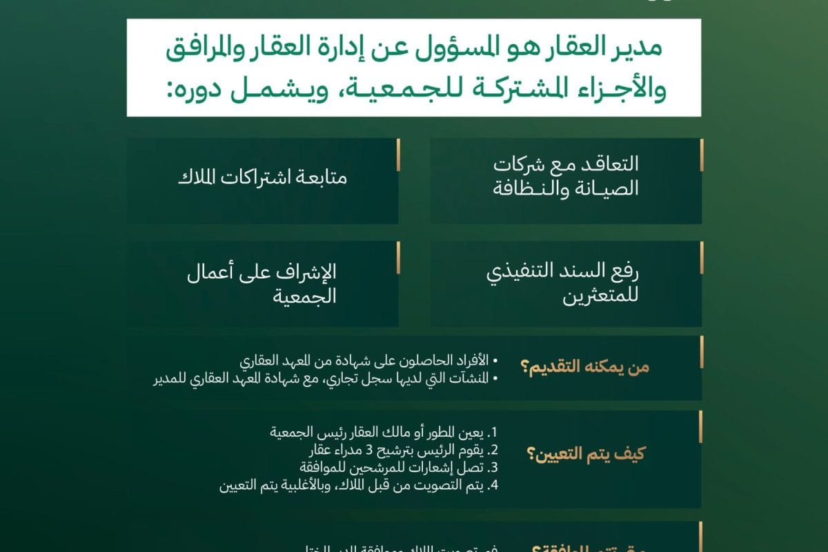 الهيئة العامة للعقار تفصّل مهام المؤهلين وإجراءات الترشيح والتصويت والتقديم الإلكتروني لتعيين وتغيير مسؤول إدارة العقار.
