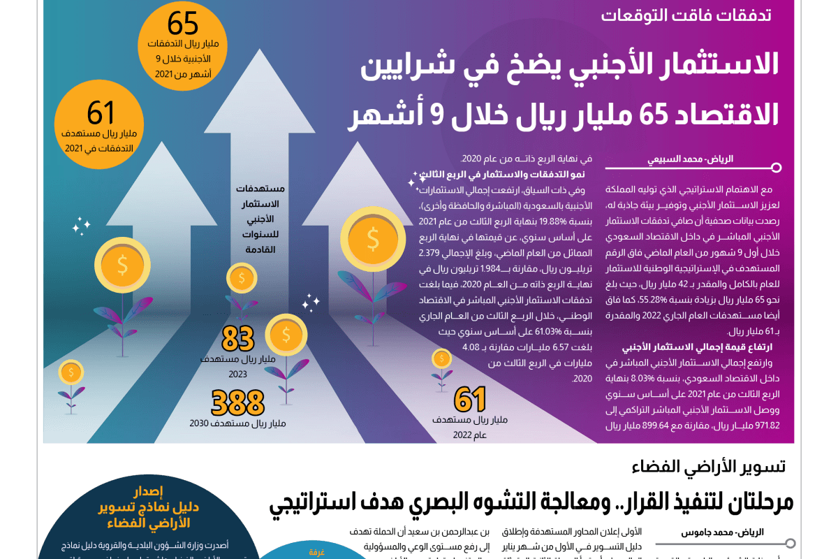 الاستثمار الأجنبي يضخ في شرايين الاقتصاد 65 مليار ريال خلال 9 أشهر