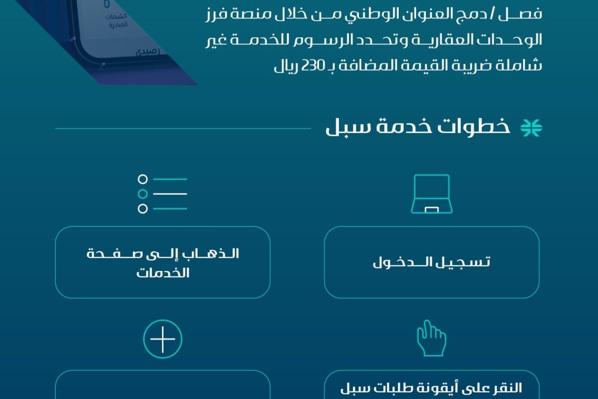 خدمة إلكترونية لطلب فصل أو دمج العنوان الوطني عبر منصة فرز، برسوم 230 ريال قبل ضريبة القيمة المضافة.