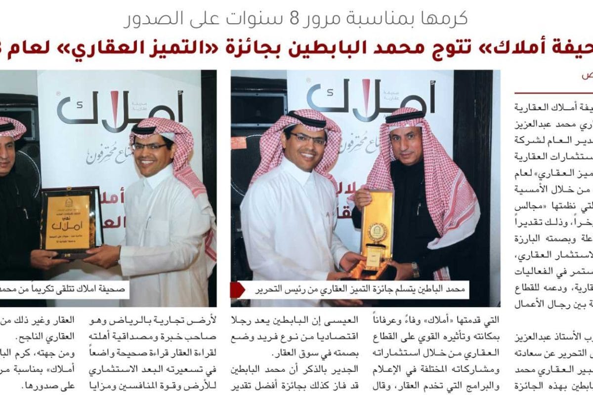 كرمها بمناسبة مرور 8 سنوات على الصدور.. «صحيفة أملاك» تتوج محمد البابطين بجائزة «التميز العقاري» لعام 2018