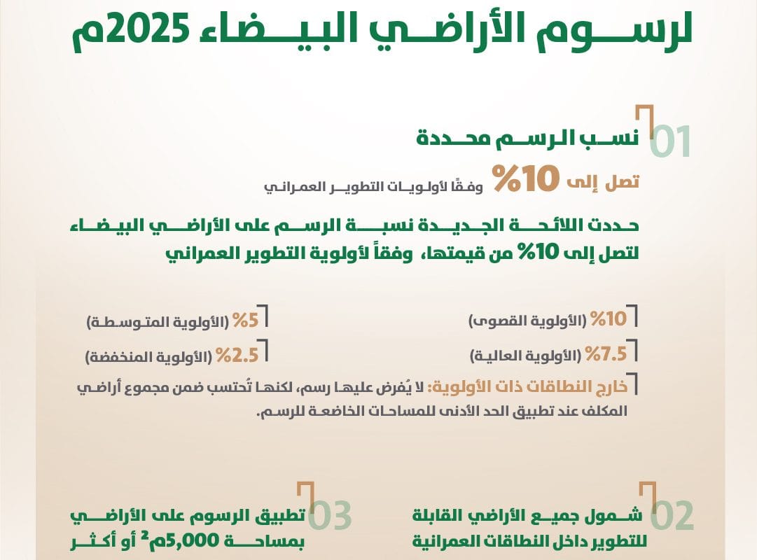 Reading time: < 1 Minuteأعلنت وزارة البلديات والإسكان عن أبرز ما تضمنته اللائحة التنفيذية المحدثة لرسوم الأراضي البيضاء لعام 2025، والتي تهدف إلى دعم جهود التطوير العمراني، وتحفيز استثمار ... Read more