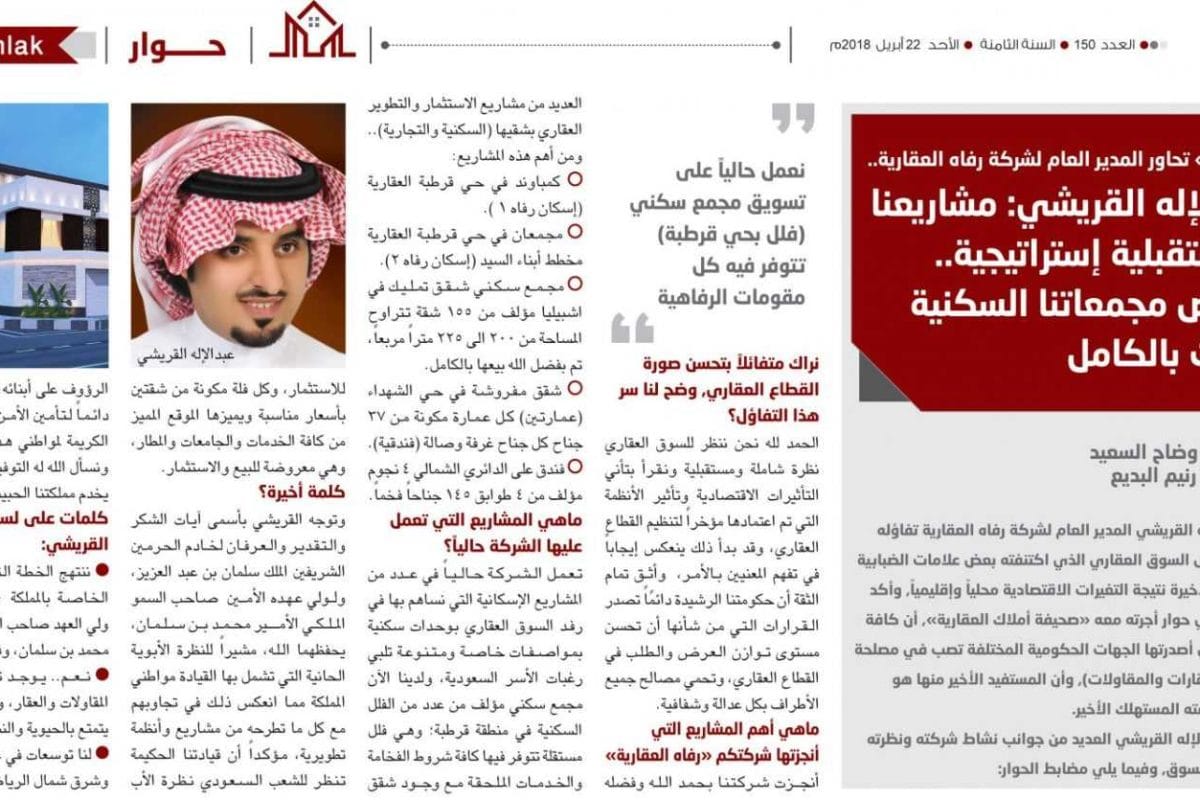 «أملاك» تحاور المدير العام لشركة رفاه العقارية.. عبدالإله القريشي: مشاريعنا المستقبلية إستراتيجية.. وبعض مجمعاتنا السكنية بيعت بالكامل