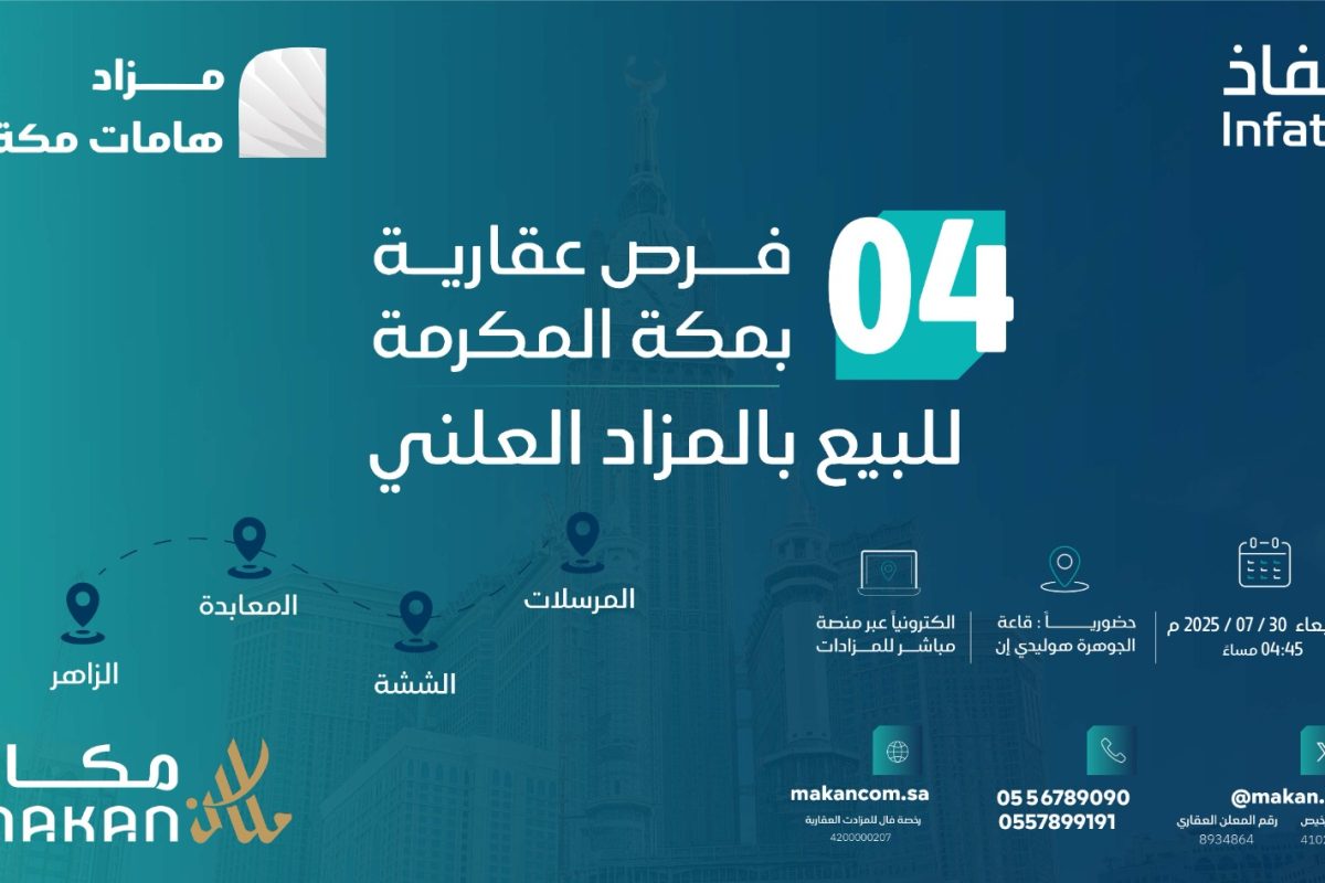 Reading time: < 1 Minuteتعلن مكان المستثمر وبإشراف مركز الإسناد والتصفية «إنفاذ» وبقرار من محكمة التنفيذ وبحكم من محكمة الأحوال الشخصية، عن إقامة مزاد “هامات مكة” حضوري/إلكتروني/هجين وذلك يوم ... Read more