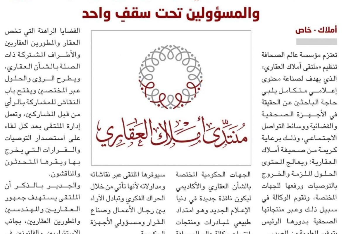 يعمل على تحديث محتوى الإعلام.. «ملتقى أملاك العقاري» ينطلق قريباً ليجمع العقاريين والمسؤولين تحت سقفٍ واحد