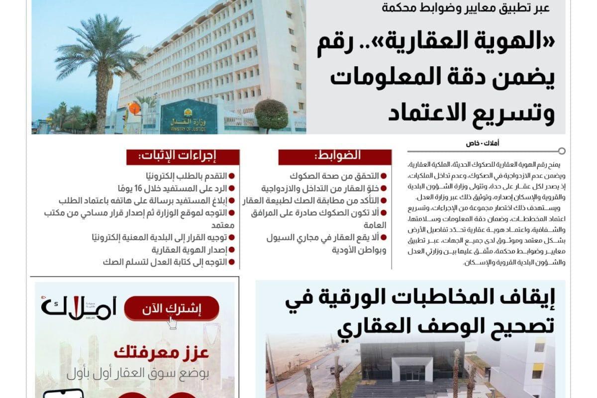 Reading time: 2 Minutesالهوية العقارية للصكوك الحديثة الملكية العقارية يمنح رقم الهوية العقارية للصكوك الحديثة الملكية العقارية، ويضمن عدم الازدواجية في الصكوك، وعدم تداخل الملكيات، إذ يصدر لكل ... Read more