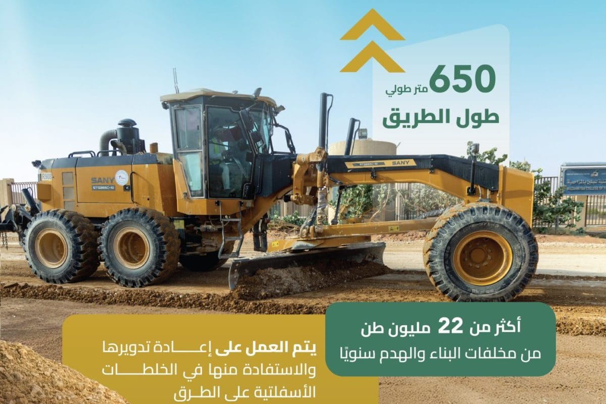 إعادة تدوير مخلفات هدم المباني في طريق الكلية التقنية بطول 650 متر لتعزيز الاستدامة وتقليل الأثر البيئي.