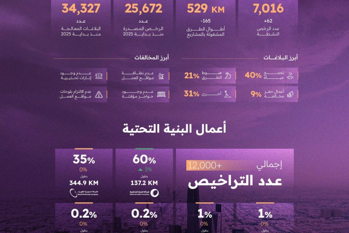 تقرير فبراير 2025 يسجل أكثر من 12 ألف رخصة وأكثر من 8,500 بلاغ؛ تجمع المياه 40% وهبوط الطرق 21%.