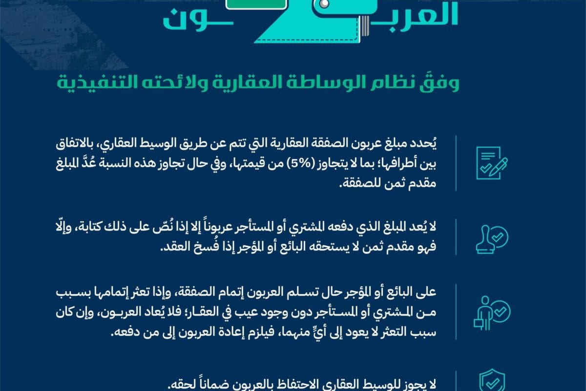 الهيئة العامة للعقار تحدد أحكام العربون: حد 5%، اشتراط كتابي، قواعد ردّ العربون وعمولة وسيط 25%.