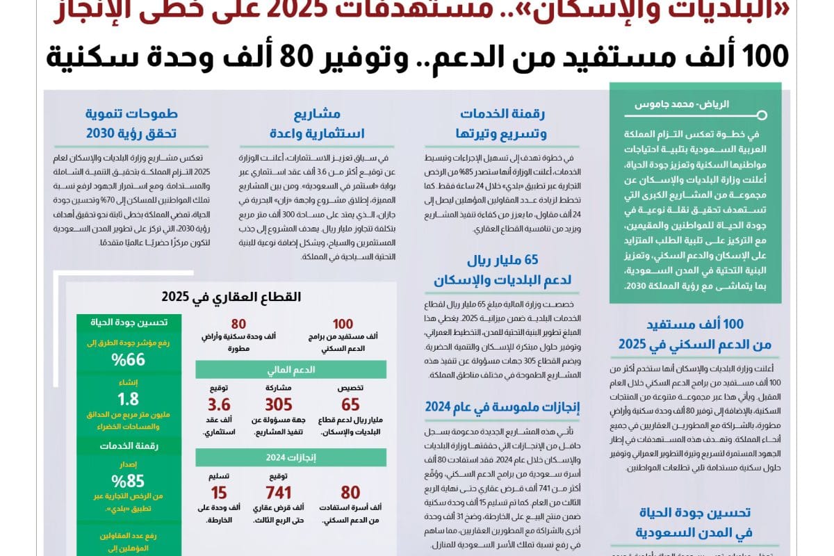 وقت القرائه: 2 دقائقحققت وزارة البلديات والإسكان تقدمًا ملحوظًا في تطوير القطاع البلدي وتحسين جودة الخدمات البلدية خلال العام 2024، وذلك في إطار جهودها المستمرة لإيجاد بيئة حضرية ... إقرأ المزيد
