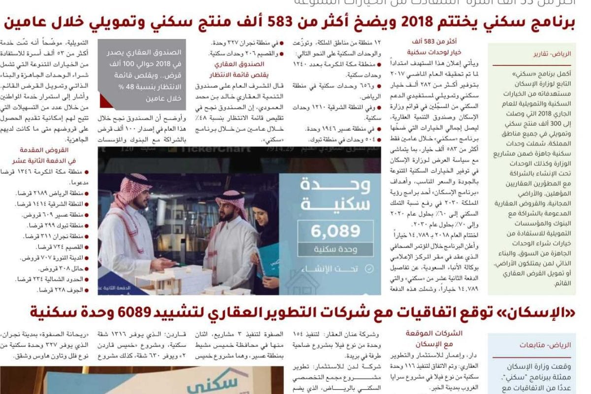 أكثر من 53 ألف أسرة استفادت من الخيارات المتنوعة.. برنامج سكني يختتم 2018 ويضخ أكثر من 583 ألف منتج سكني وتمويلي خلال عامين