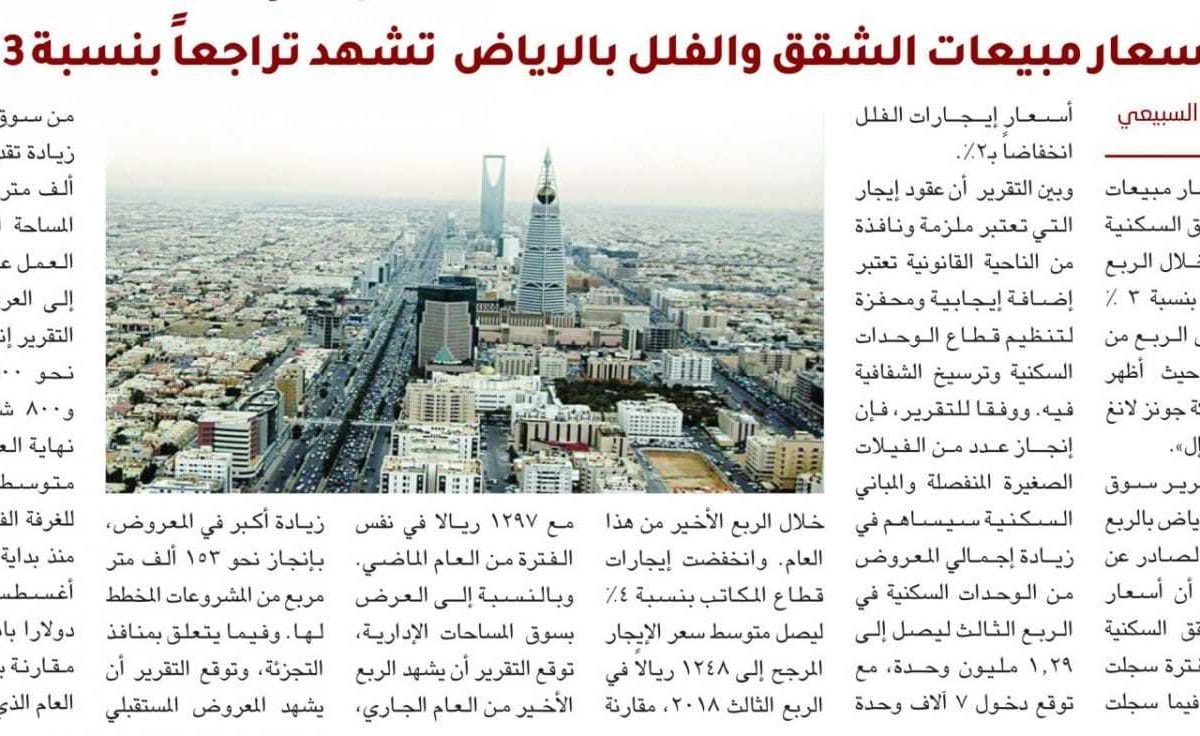 أسعار مبيعات الشقق والفلل بالرياض تشهد تراجعاً بنسبة 3 %